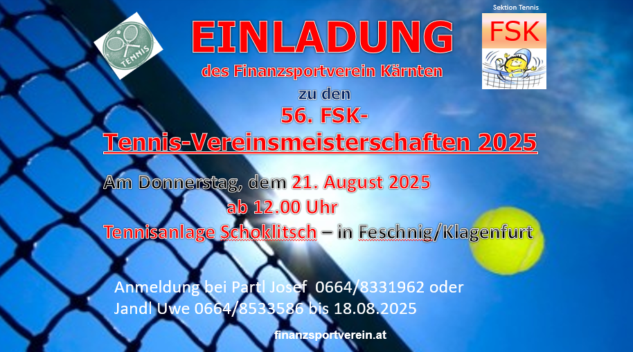 Der Finanzsportverein Kärnten lud zu den 55. FSK-Tennis-Vereinsmeisterschaften am 29. August 2024 bei der Tennisanlage Schoklitsch in Klagenfurt Feschnig ein.